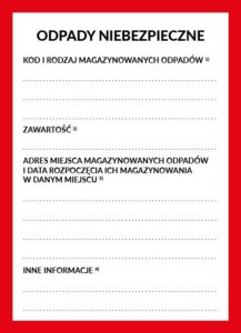 Etykiety na odpady niebezpieczne zostały starannie opracowane, aby zapewnić pełną zgodność z obowiązującymi przepisami prawa dotyczącymi oznakowania opakowań, pojemników, kontenerów i worków do magazynowania odpadów niebezpiecznych. Etykiety spełniają wymogi określone w Rozporządzeniu Ministra Klimatu z dnia 11 września 2020 r. w sprawie szczegółowych wymagań dla magazynowania odpadów – §9 pkt 4.